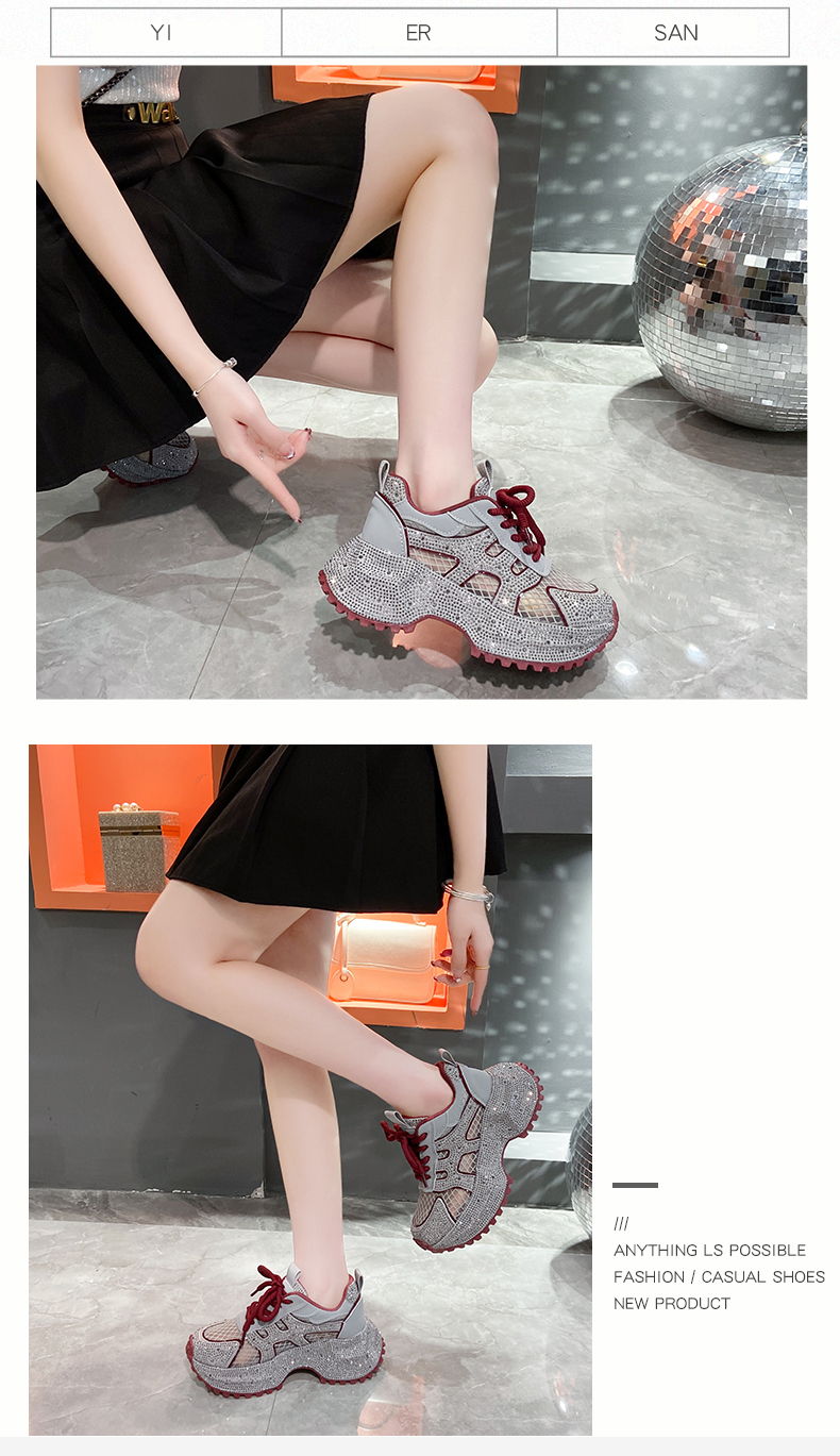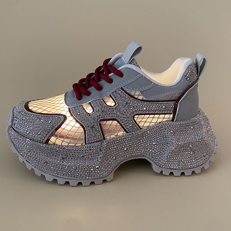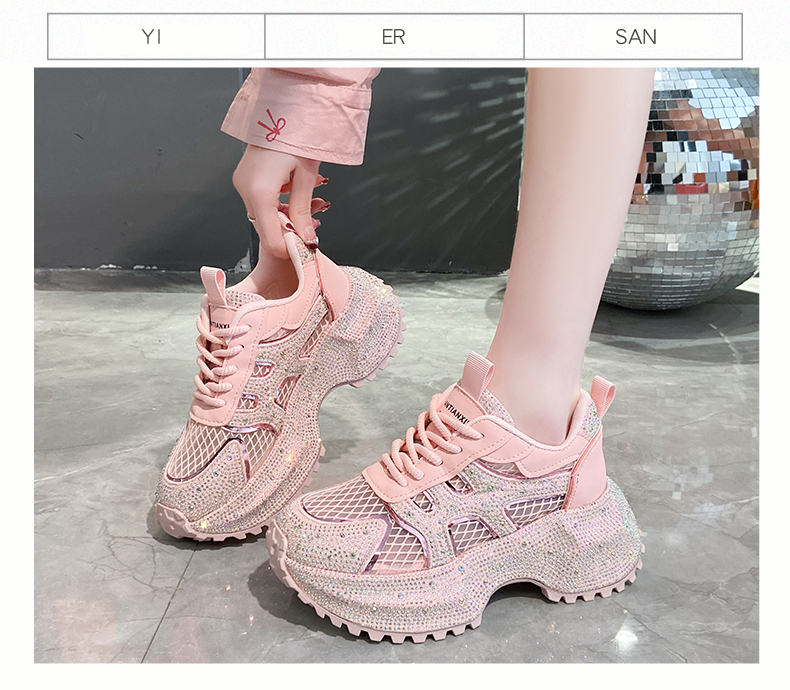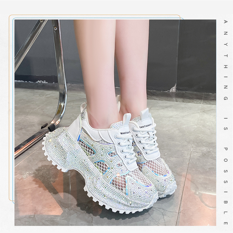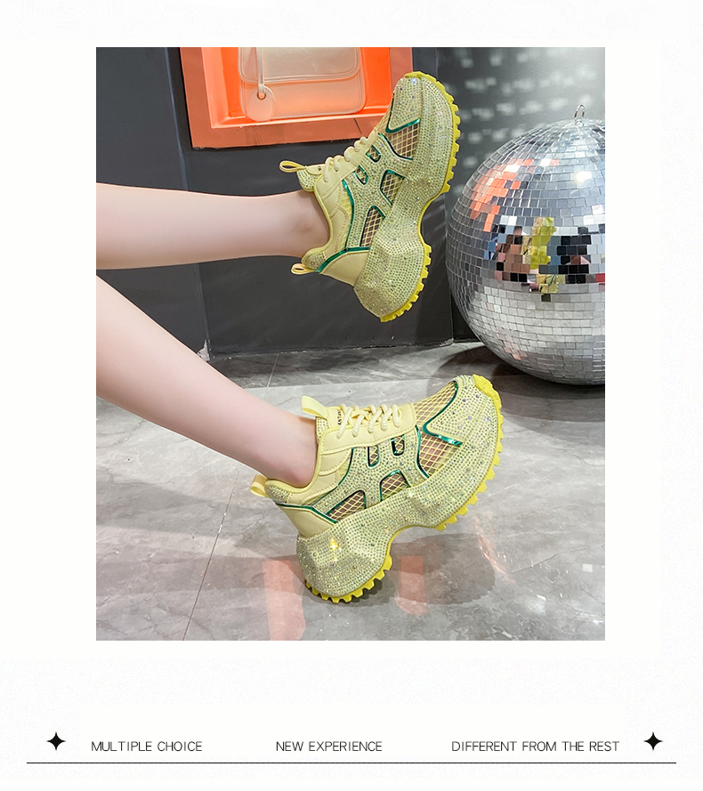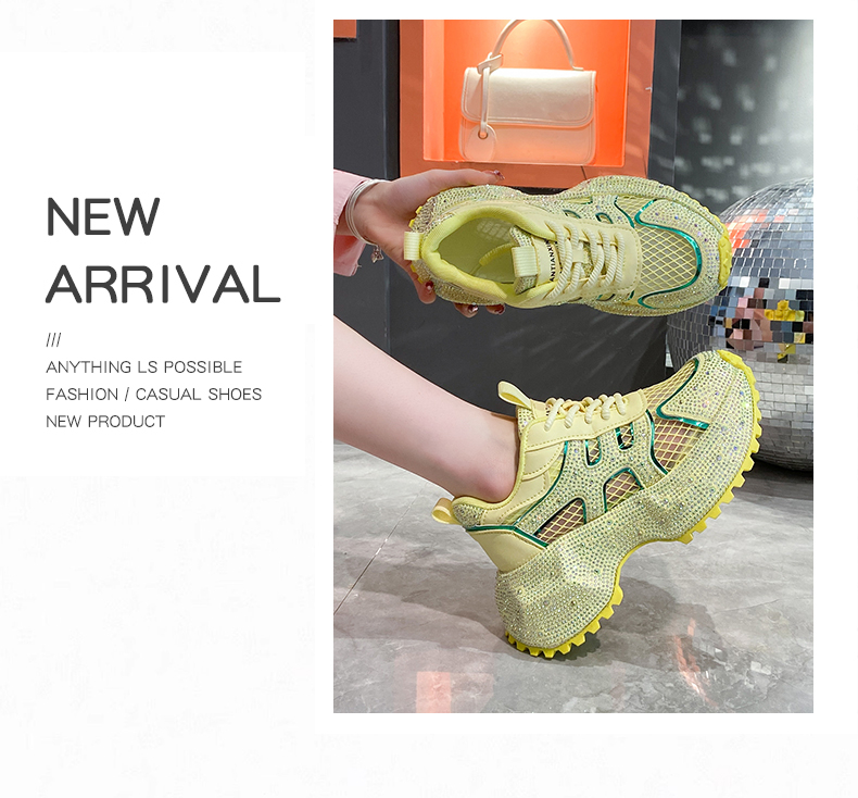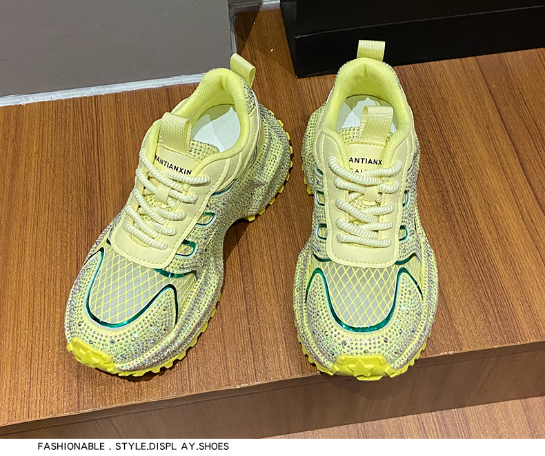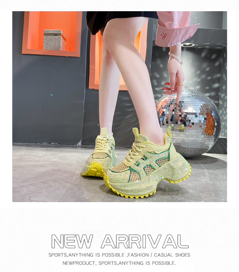 TIANXIU Women’s Chunky Platform Sneakers – Yellow Glitter Sneakers with Rhinestone Accents, Green Trim & Thick White Sole