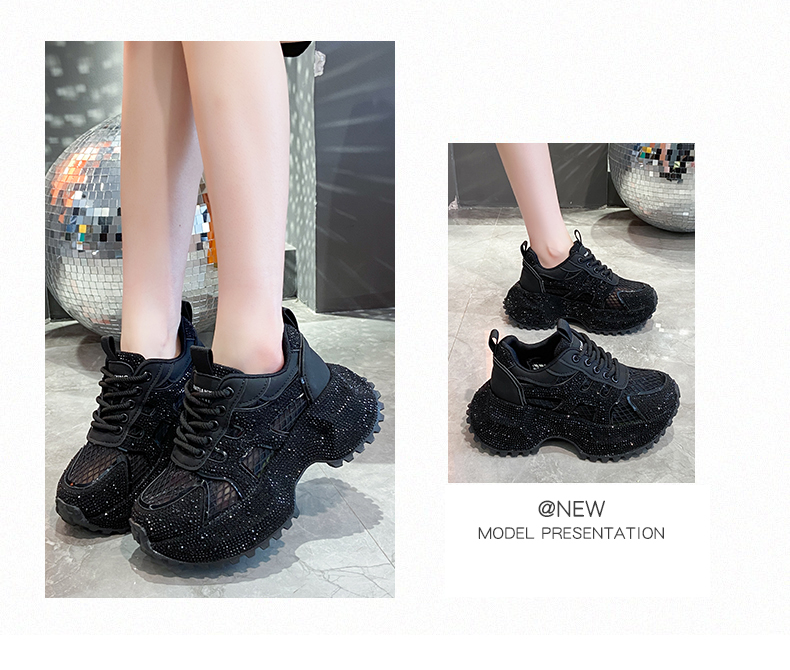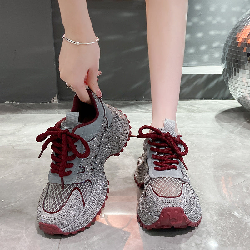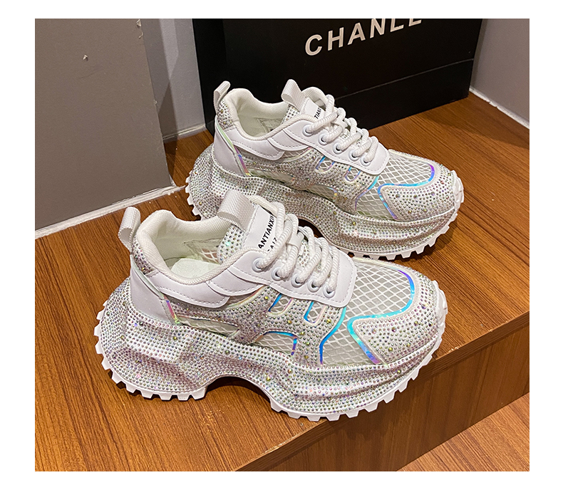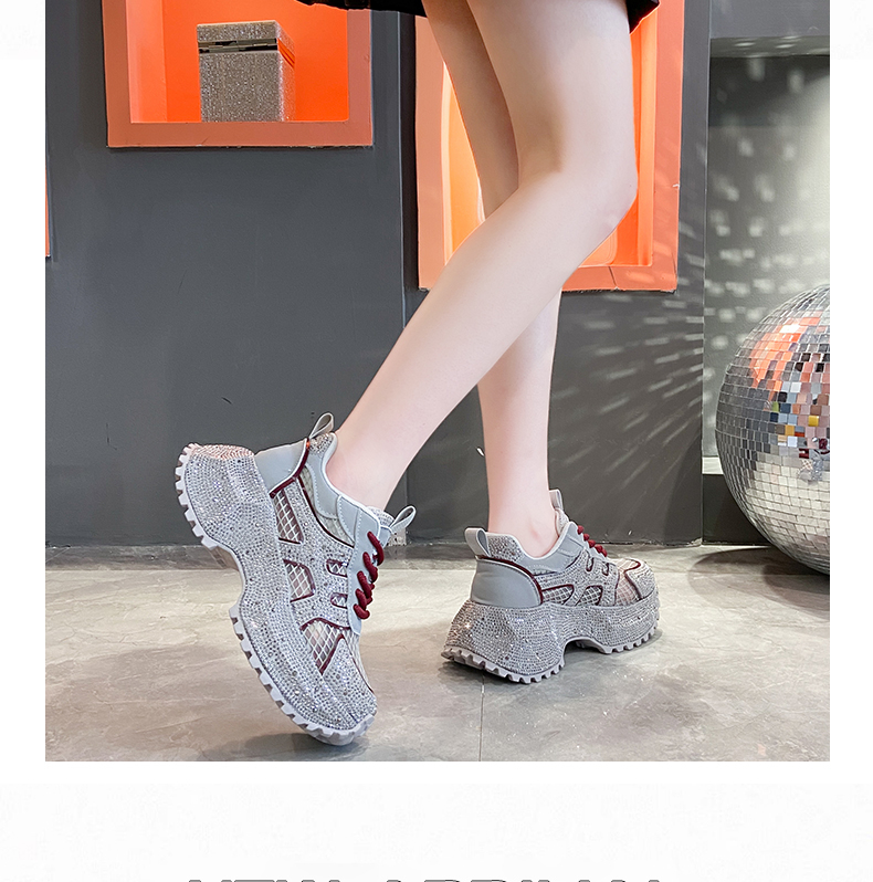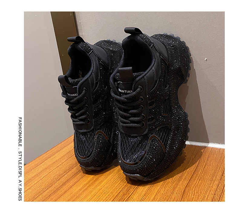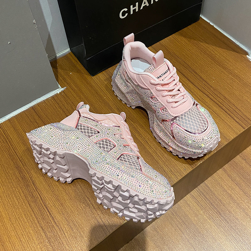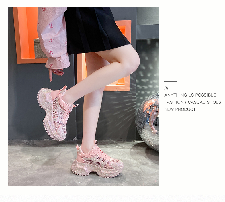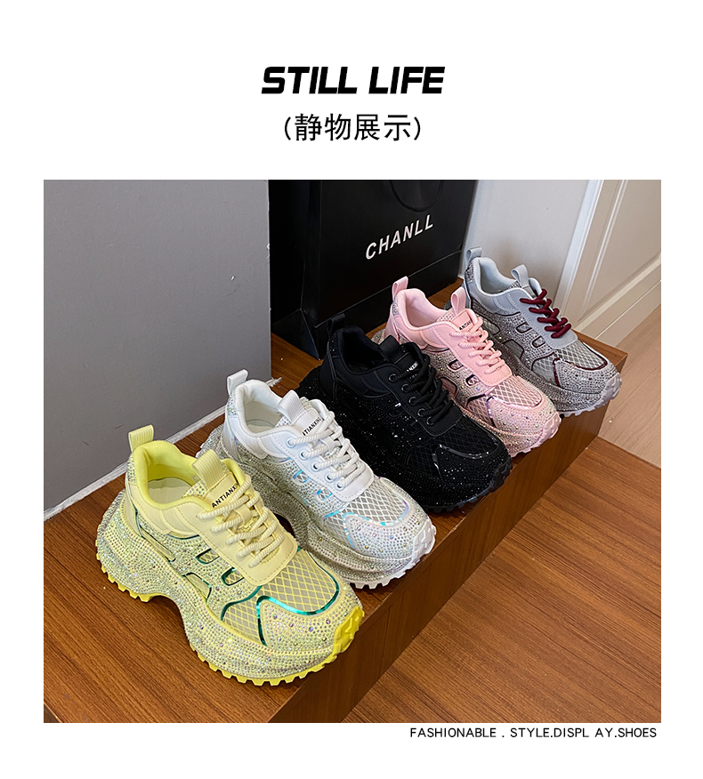 TIANXIU Women’s Chunky Platform Sneakers – Yellow Glitter Sneakers with Rhinestone Accents, Green Trim & Thick White Sole